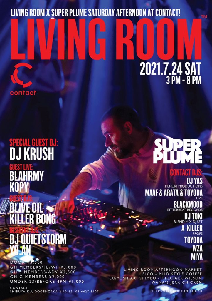 渋谷Contact Tokyoにて、7/24 (土)にアブストラクト/ビートミュージックの最高峰を楽しむLIVING ROOM大祭「LIVING ROOM? × Super Plume」が開催される。