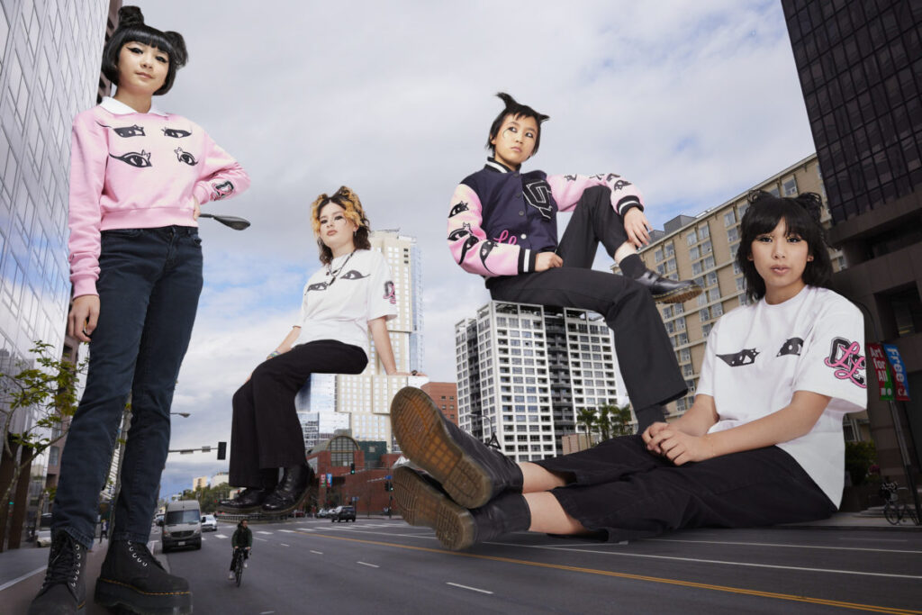 キックオフとなる本コレクションは、The Linda Lindasのシグニチャーである「キティライナー」のアイメイクのイラストをプリントしたオーバーサイズTシャツとクロップド丈のスクールガール風のクルーネックトップに加え、”LL” (The Linda Linda’s のロゴ)のロゴと、来る4月8日にEpitaph Recordsからリリースされるデビューアルバム「Growing Up」のカバーのアートワークを配したピンクとパープルのOCジャケット(バーシティジャケット)で構成されている。