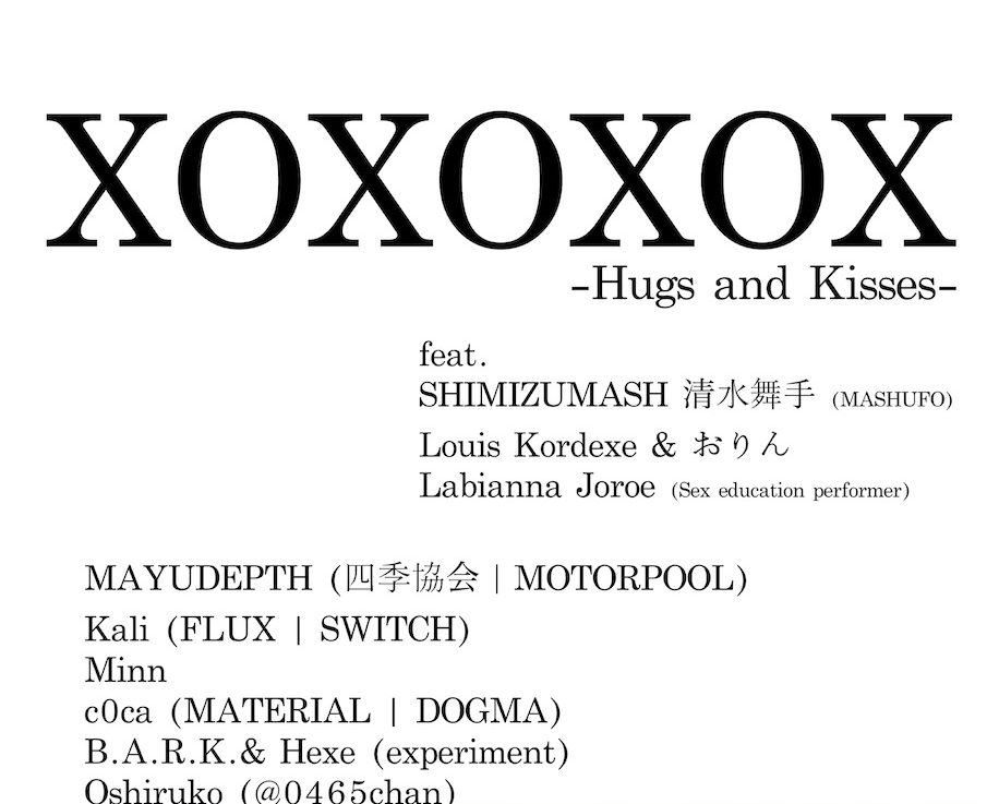 さらなる高揚をさがす今回のXOXOXOXのゲストは、Vol.1でこのパーティの理想の瞬間を実現させたMAYUDEPTHが帰還。シアトルのクィアレーベル[Bottom Forty]や、ベルリンBUTTONSからもピックアップされてきた才能は、ロマンティックなまでに狂気的なドープネスと、体の静止を許さない強い推進力でオーディエンスに高い満足度を提供した。特殊な想像力で生み出されるハードグルーヴが非現実的なサウンドスケープを描くKaliや、波状のイマジネーションの移り変わりで快楽を連続させるMinn、渋谷の地下シーンで勢力を広げるハード/インダストリアルテクノパーティMATERIAL主催のc0caといった強靭なDJとの共演は、現実との境界線をぼかすための徹底したキュレーションといえる。さらに、フェティシズムとテクノが交錯する密夜 experiment主催のB.A.R.K & Hexeのハードインダストリアルや、ベルリン直系のサウンドを有するカリスマSiSeN、XOXOXOX支配人Pinkspineの有機質を含むモダンなテクノなど、多幸的な遊戯が隙間なく埋める。