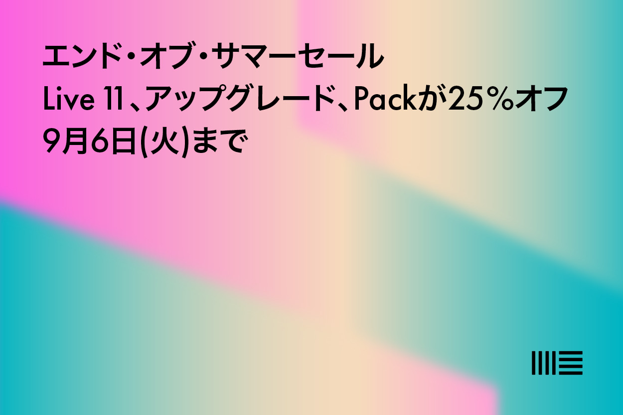 9月6日(火)まで行われるエンド・オブ・サマーセールでは、 新規購入(Live 11 Suite、Live 11 Standard、またはLive 11 Intro)、およびアップグレード(Live 11 Suite、またはLive 11 Standard)、Abletonの全Packを25%オフで購入可能。