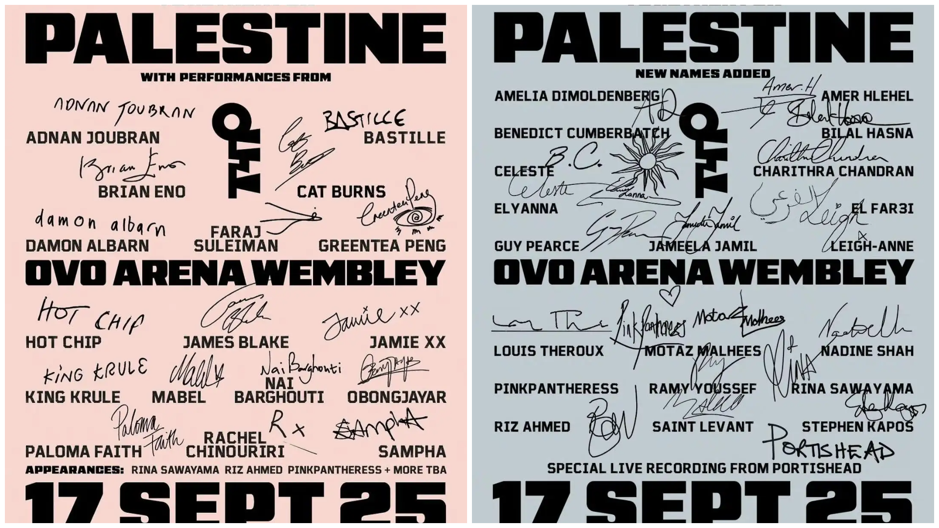 イギリス時間の17日 (水) 午後7時 (日本時間 9月18日 (木) 午前3時)、ロンドン・OVO Arena Wembleyにて、ブライアン・イーノが主催するチャリティコンサート「Together For Palestine」が開催される。このコンサートでは、ブライアン・イーノの声がけで集まったデーモン・アルバーン、ジェイムス・ブレイク、ジェイミー・エックス・エックス、サンファ、キング・クルール、ホット・チップ、リナ・サワヤマらが、パレスチナのアーティストたちが共演し、音楽を通じて連帯と希望を示す特別な一夜となる。