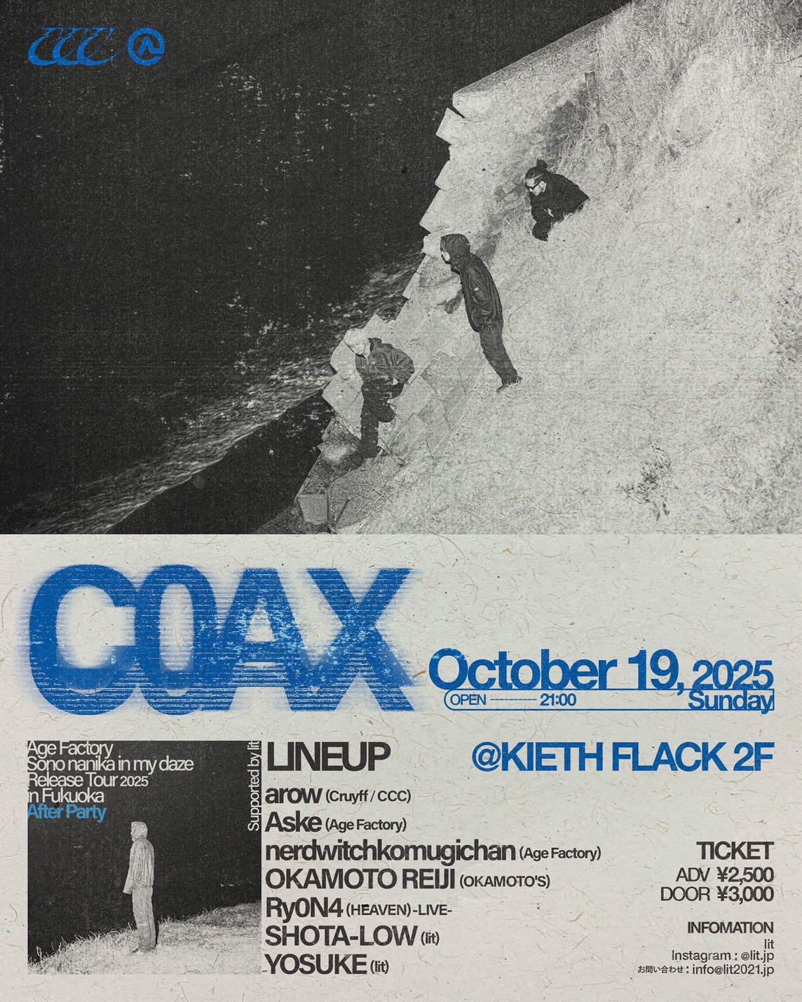 2025年10月19日(日)、福岡・KIETH FLACKにて「C0AX」開催。Age Factoryの最新作「Sono nanika in my daze」リリースツアー福岡公演に続くアフターパーティーとなる。