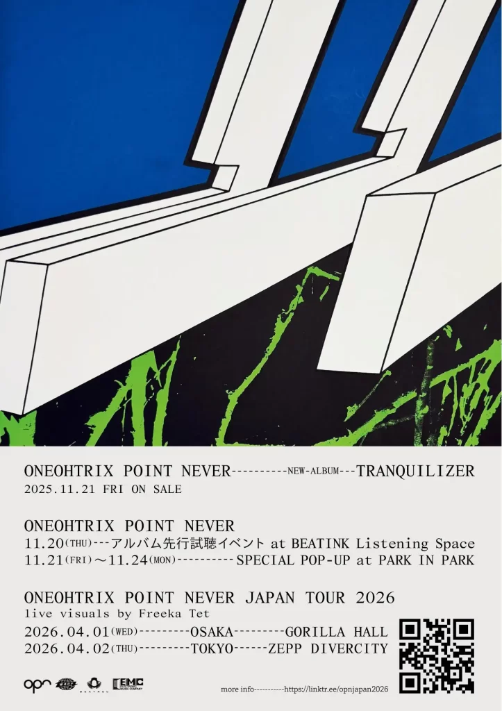 Pitchfork【Best New Music】に選出されるなど、早くも傑作との呼び声が高いワンオートリックス・ポイント・ネヴァー(以下 OPN)の最新アルバム『Tranquilizer』。前回ツアーでもタッグを組んだ奇才フリーカ・テットと、さらに進化した最新ライブセットでの来日が決定し注目が高まる中、ニューアルバム『Tranquilizer』のリリースを記念した特別イベントが原宿と渋谷の二会場に加えて大阪での開催も緊急決定 (特別イベントは3会場とも入場無料)。