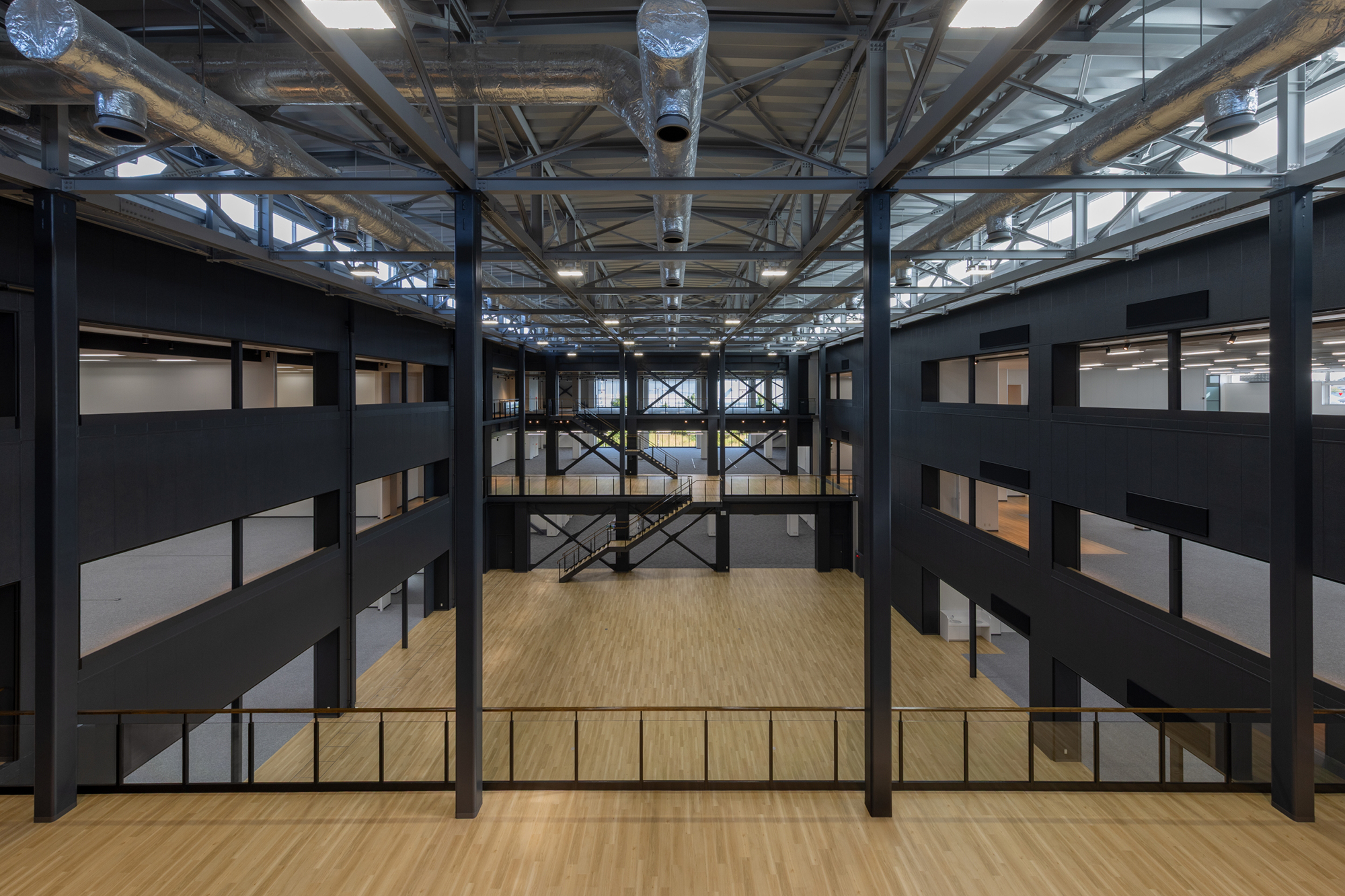新本社の内部は、全体を見渡すことができる広い吹き抜けの「ローランド・アリーナ」を中心に、すべての部門が集える場となっています。新本社に勤務する社員約600名の3分の2が開発担当者であることから、オフィスエリアは、製品開発に関わるそれぞれの職性に合わせて、設備やレイアウトが最適化されたワークスペースの視点でデザインされています。