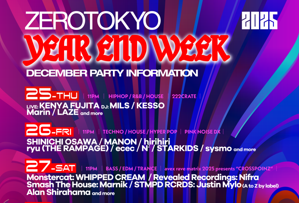 東京・ZEROTOKYOが2025年12月25日から12月31日まで7日間連続で年末イベント「ZEROTOKYO 2025 YEAR END WEEK EVENT」を開催する。