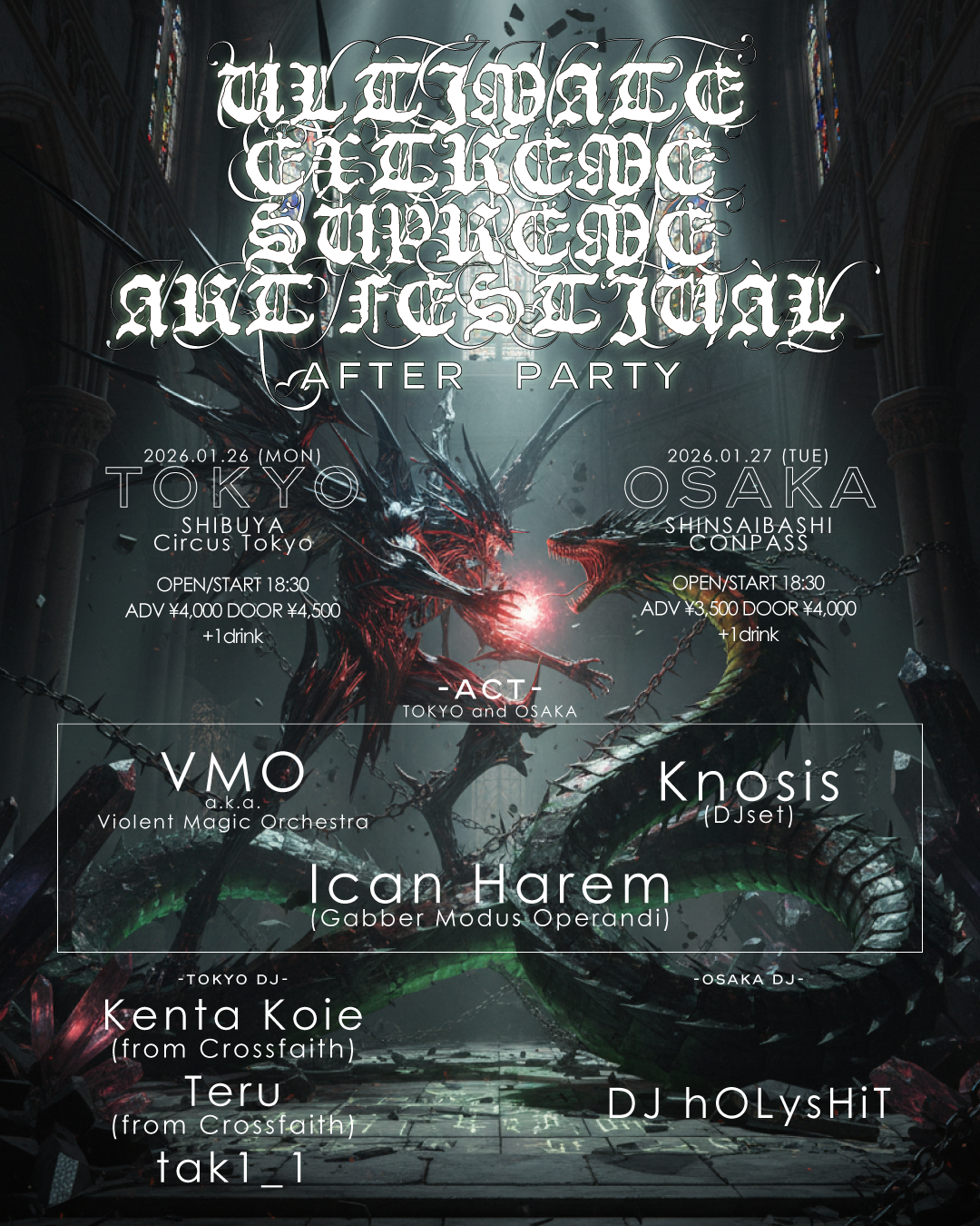 アフターパーティーには、KNOSIS( DJ SET) が両日出演。東京公演では、CROSSFAITH より Kenta Koie、Teru がDJとして参加し、東京・大阪それぞれのフロアを肉弾戦と化す。