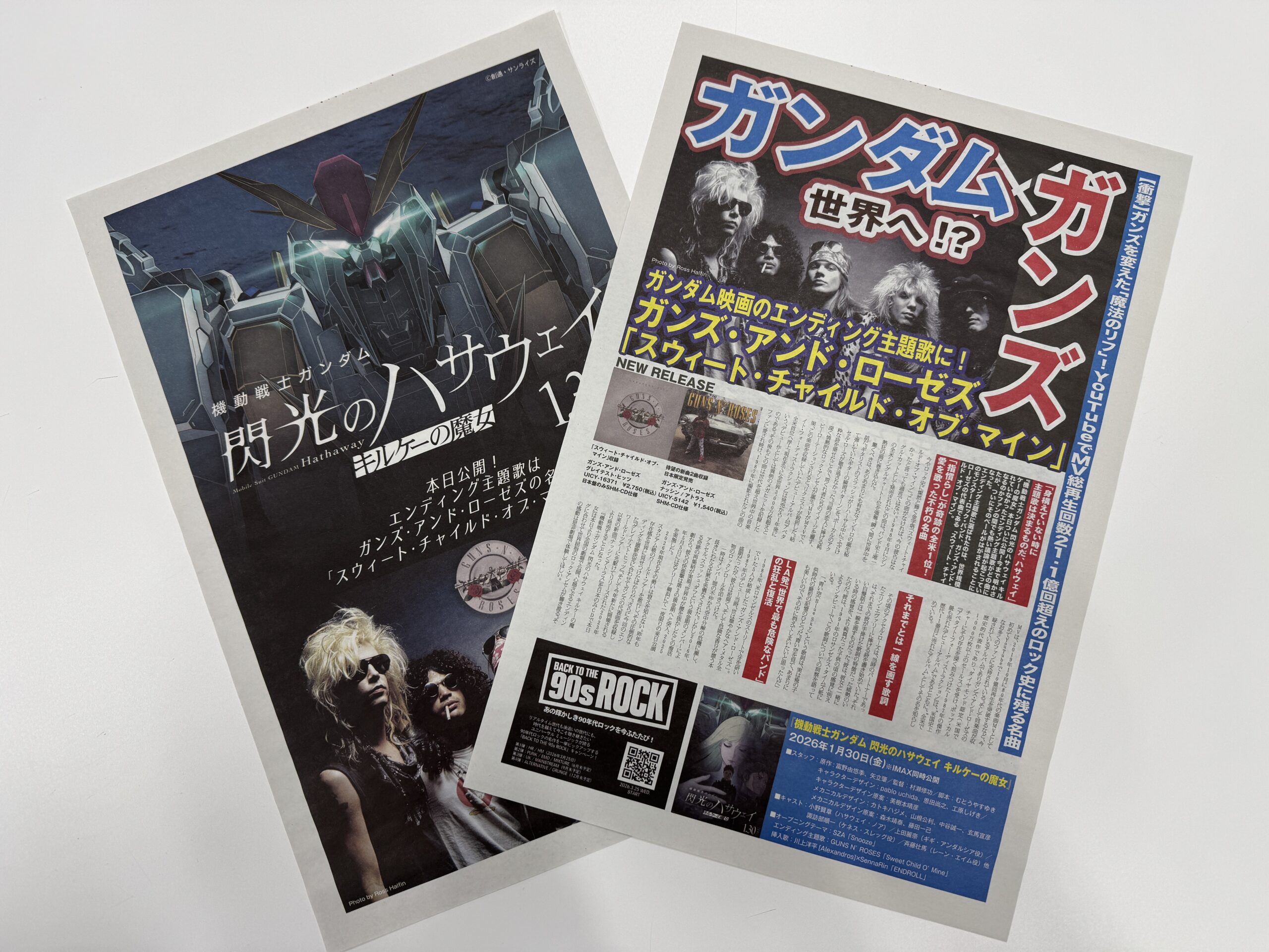 本日1月30日(金)公開のガンダムシリーズ最新作、映画『機動戦士ガンダム 閃光のハサウェイ キルケーの魔女』のエンディング主題歌に、ガンズ・アンド・ローゼズの代表曲「スウィート・チャイルド・オブ・マイン」が決定したことを記念し、東京の渋谷・池袋にて号外が配られた。