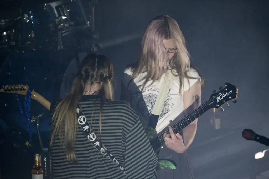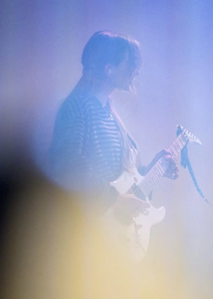 演奏のパンク的要素は増幅している。その中核にいるのがギタリスト、へスター・チェンバースだ。ノイジーだけど、ポップな演奏が時折空間を切り裂く。かつてはリアンと並んで立つ2人組の姿が象徴的だったが、今のへスターは一歩引き、スモークの奥で演奏に徹する。それは、5人編成のロックバンドに振り切った選択、新たなウェット・レッグの姿だ。ミニスカートで、モッキンバードのスケルトンギターを手にしたリアンをより引き立てる。